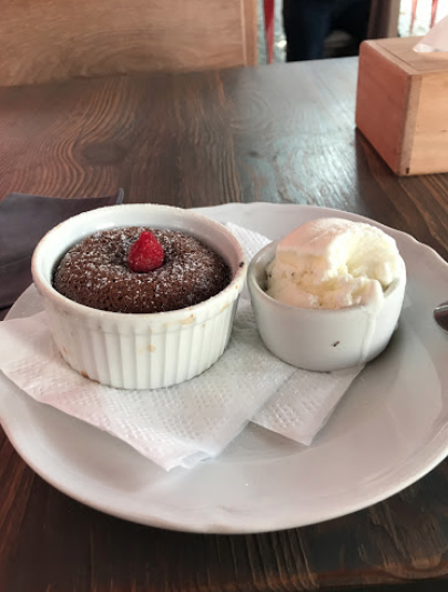 Шоколадний фондан подають в керамічній креманці, морозиво окремо (і, до речі, до десерту морозиво не входить, офіціанти запитують, чи хочете ви морозива).
