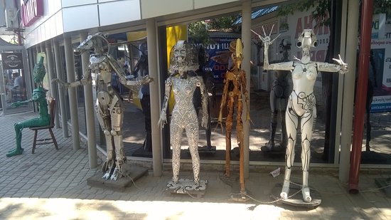 Очень привлекают внимание стоящие по всему периметру пиццерии страшновато-красивые фигуры-роботы. В самом же заведении интерьер не так ошеломляет. Кухня вкусная, десерты - еще лучше) Можно и с малышами приходить, заметила аккуратно накрытые пленкой стульчики для кормления.Официанты доброжелательные и приятные.